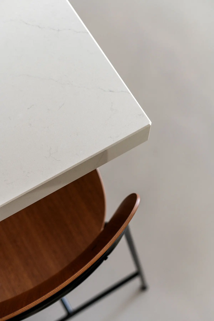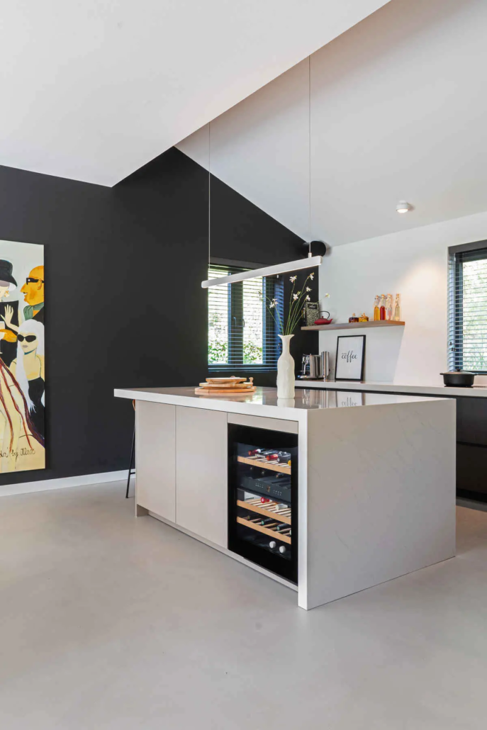 “We wilden de keuken graag op de huidige plek laten zitten, met zicht aan de voorkant van het huis”, legt Isabelle uit. “Tegelijkertijd wilden we een eiland, zodat we daar lekker omheen konden staan en meer afzetruimte hadden. Het is nu echt een werkeiland geworden, met ook een zitje eraan. We gebruiken het dagelijks, ’s ochtends voor het ontbijt of om even te werken achter de laptop.”