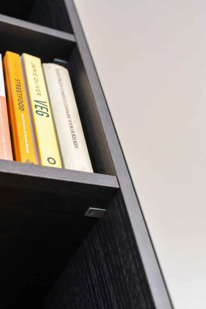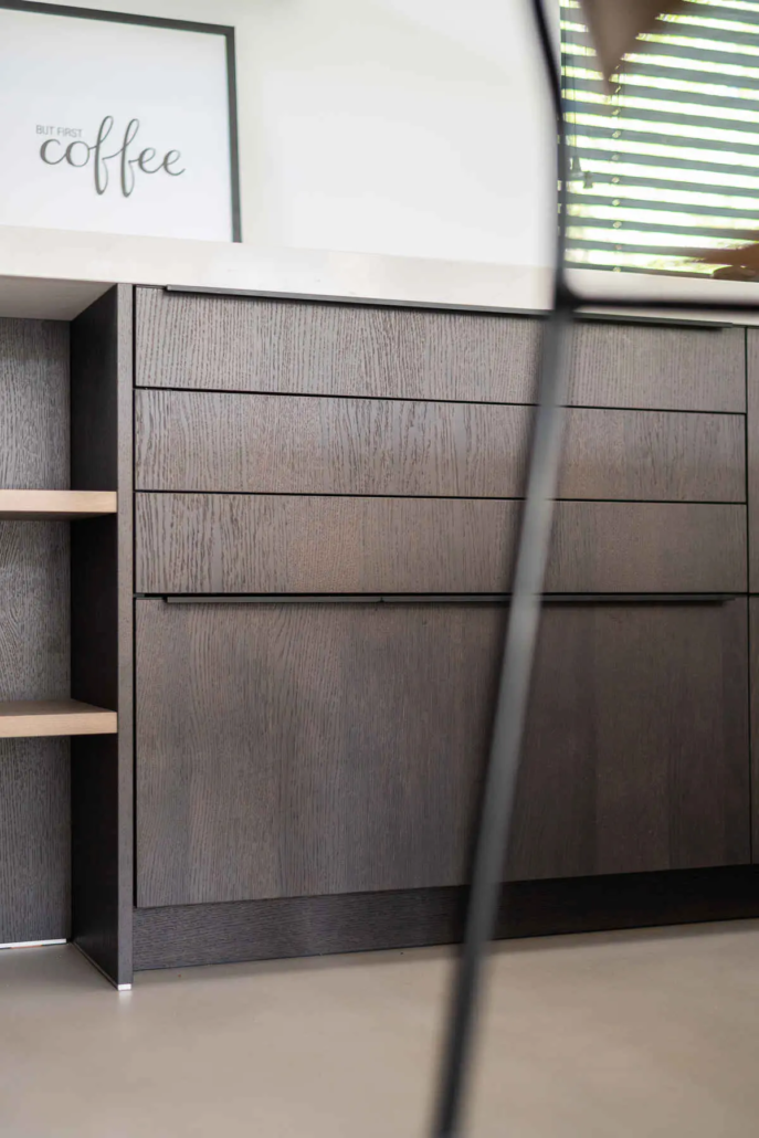 Voor Isabelle was het belangrijk dat de keuken en woonkamer één geheel zouden vormen. “Wat ik heel tof vind, is dat de hoge keukenwandkast dezelfde kleur heeft als de vakkenkast in de woonkamer. Daardoor lijkt het alsof het één groot meubel is. Het contrast met het donkere, warme hout maakt het echt een heel mooi element in huis.”